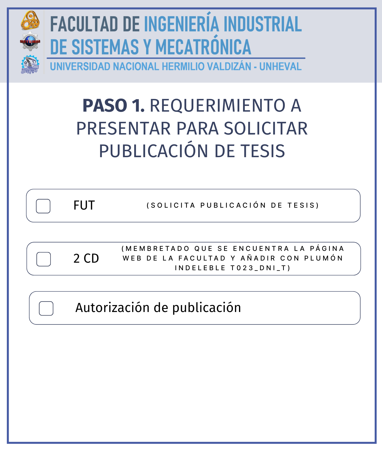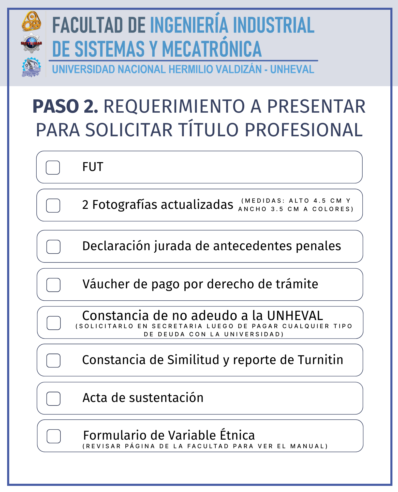 Haber cumplido con el trámite de publicación de tesis o tesis proyectual aplicada a proyectos arquitectónicos o trabajo de suficiencia profesional en el Repositorio Institucional - UNHEVAL.
