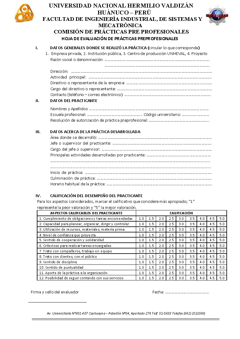 -Hoja de evaluación de la empresa (según el Reglamento de Prácticas Preprofesionales de la Facultad). Link
